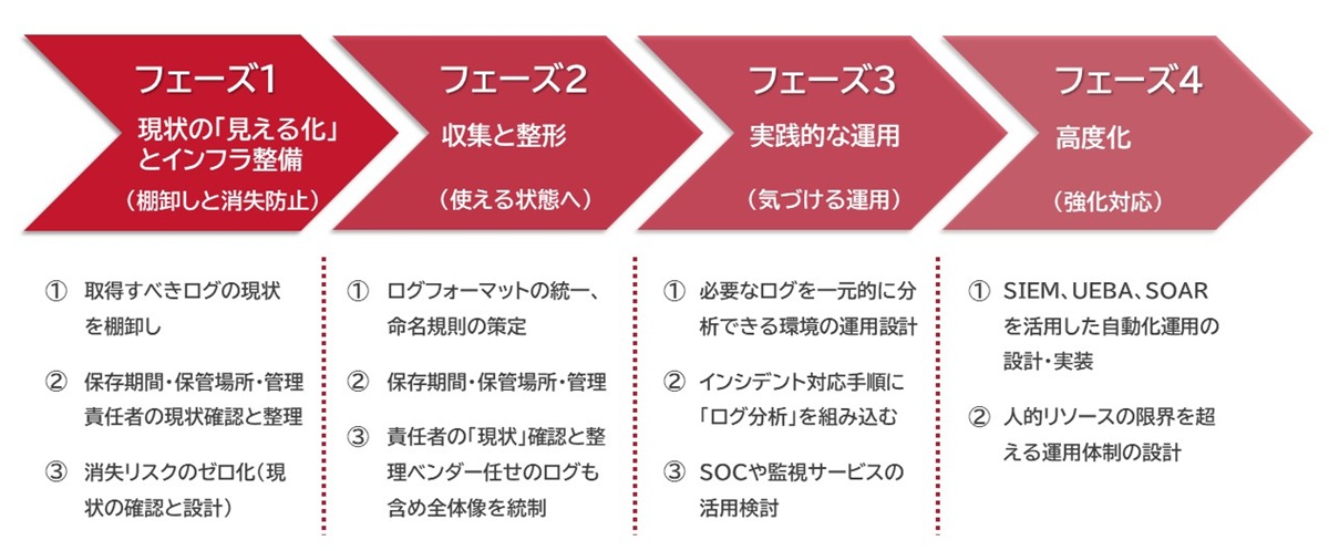 ログ管理体制の構築では、「SIEMなどの高機能ツールを導入すれば解決する」と捉えられがちですが、実効性のある体制を整えている組織ほど、段階的に成熟度を高めています。